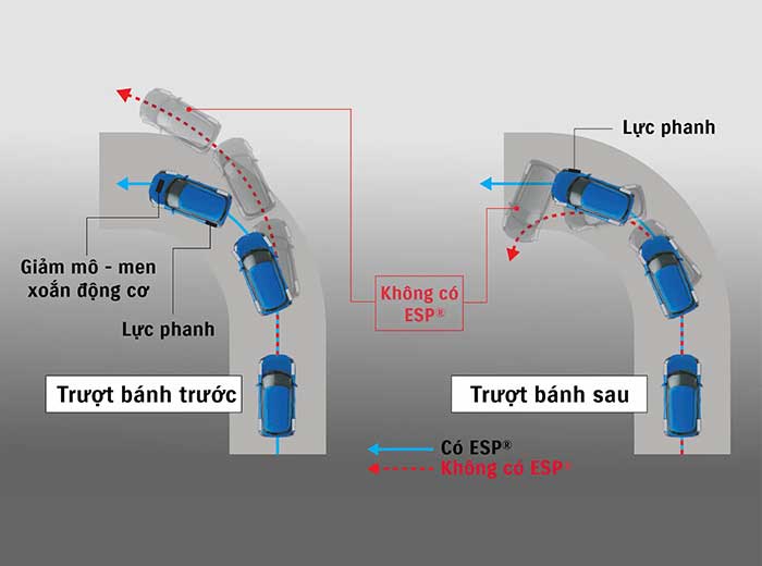 Nếu xảy ra hiện tượng trượt bánh, hệ thống sẽ tự động điều chỉnh công suất động cơ và phanh để kiểm soát hiện tượng trượt bánh, đảm bảo xe luôn vận hành theo quỹ đạo mong muốn.