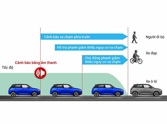 Sử dụng radar sóng milimet và camera đơn để phát hiện phương tiện, xe đạp, người đi bộ phía trước. Khi phát hiện nguy cơ va chạm, hệ thống sẽ cảnh báo bằng âm thanh và hình ảnh, hỗ trợ phanh hoặc tự động phanh nếu cần thiết để giảm thiểu tác động.