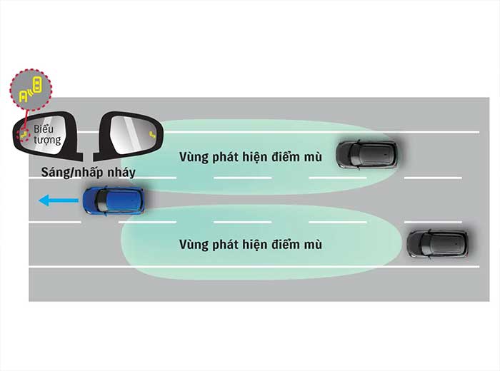 Cảm biến radar phía sau giúp phát hiện xe trong vùng điểm mù. Khi có xe đến gần, đèn cảnh báo sẽ hiển thị ở gương chiếu hậu cùng hướng. Nếu bật xi nhan, đèn sẽ nhấp nháy kèm âm báo.