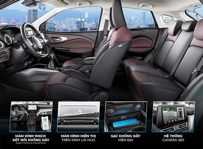 Khoang lái Fronx nổi bật với ghế hai tông màu đen – đỏ Bordeaux kết hợp da nhân tạo và nỉ cao cấp, sang trọng và cá tính. Trang bị màn hình giải trí 9” kết nối không dây Apple CarPlay & Android Auto, HUD hiển thị tiện ích, sạc không dây chuẩn Qi và camera 360 – tất cả mang đến trải nghiệm lái hiện đại, đầy cảm hứng.