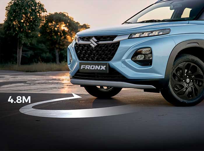 Với bán kính quay đầu chỉ 4.8m dẫn đầu phân khúc, Fronx linh hoạt trên những con phố chật hẹp hay khúc cua gắt, mang đến sự tự tin tối đa khi di chuyển trong đô thị.